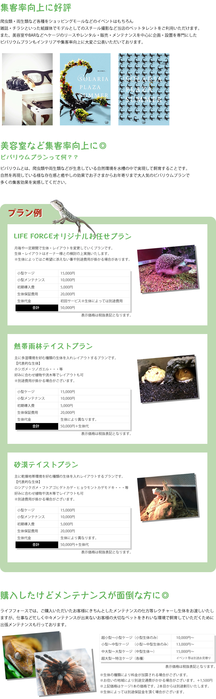 ライフフォースでは、爬虫類・小動物・金魚など様々なペットを販売からメンテナンスまでトータルにお客様をサポート致します。